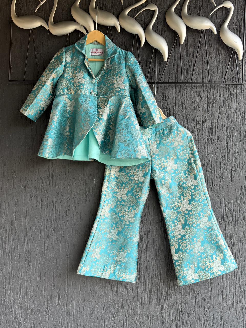 | This elegant co-ord set exudes a refreshing blend of grace and contemporary style. The outfit features a beautifully flared aqua blue top crafted in luxurious brocade fabric with cotton lining, highlighted with delicate gold floral motifs throughout. Designed with a smart lapel-style collar and front button closure, the top is layered over a soft solid inner for added structure and comfort. It is paired with matching wide-leg pants adorned with the same intricate gold detailing, creating a seamless and sophisticated look |
