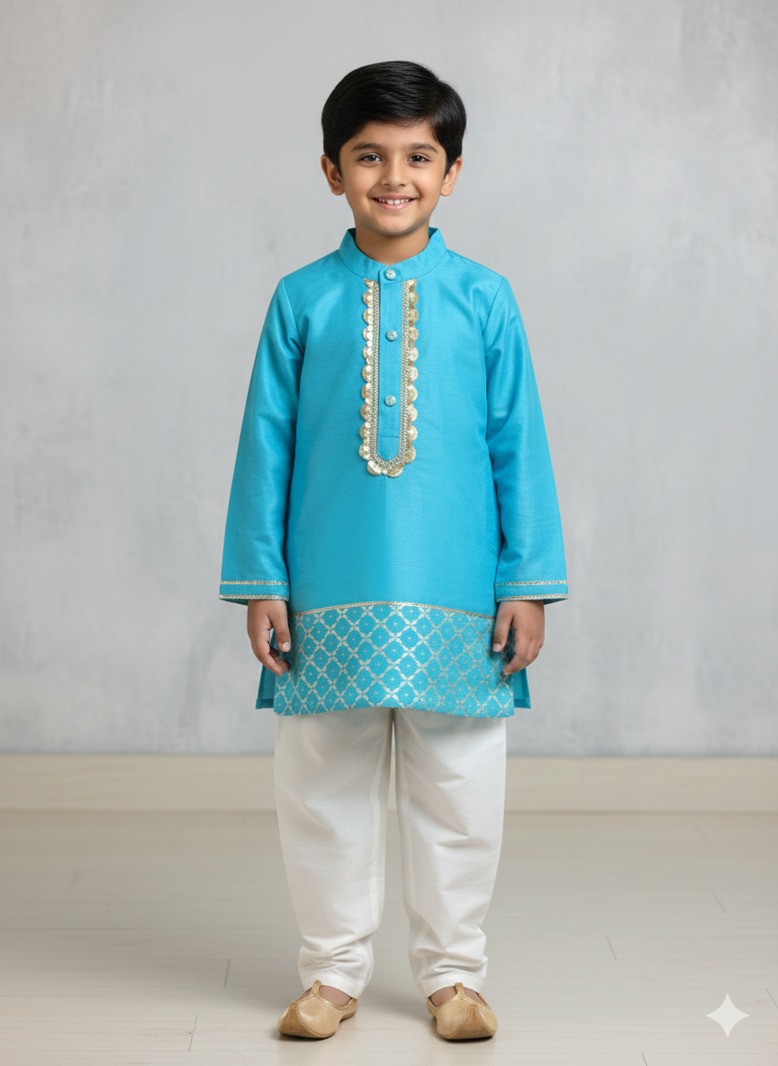 | aqua blue kurta with golden lace , cotton lining for extra comfort. Paired with crisp white pajamas with elastic on waist |