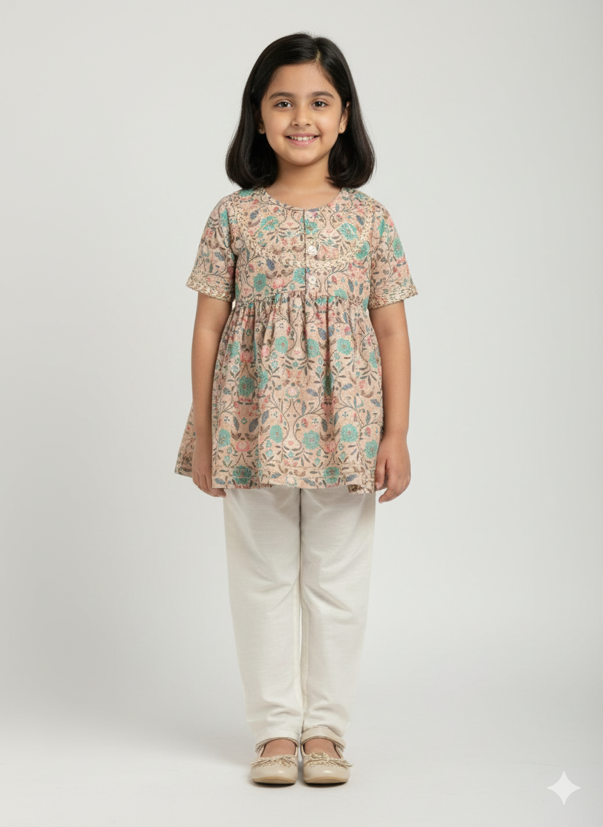 Elevate your ethnic wardrobe with this exquisite Beige Floral Jaal Printed Kurta, designed with a front open style for a contemporary twist. The kurta features a stunning gota work yoke, beautifully accented with delicate lace that enhances its intricate craftsmanship. The gathered ghera adds volume and flow, creating a graceful silhouette that moves elegantly with every step. Paired with a comfortable bottom featuring an elasticated waist, this ensemble blends traditional design elements with modern comfort, making it perfect for festive occasions and stylish daywear alike.