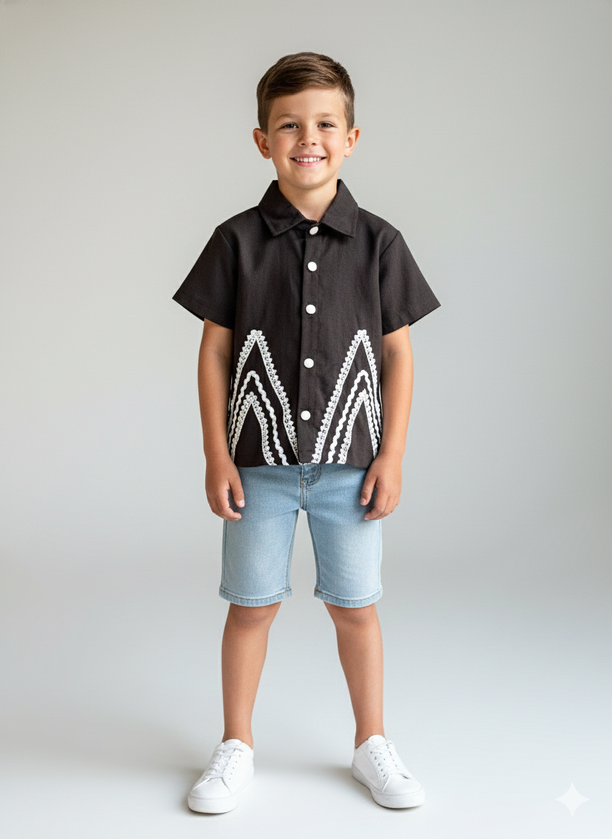 | Black slub shirt with crochet lace patch with and front opening buttons. |