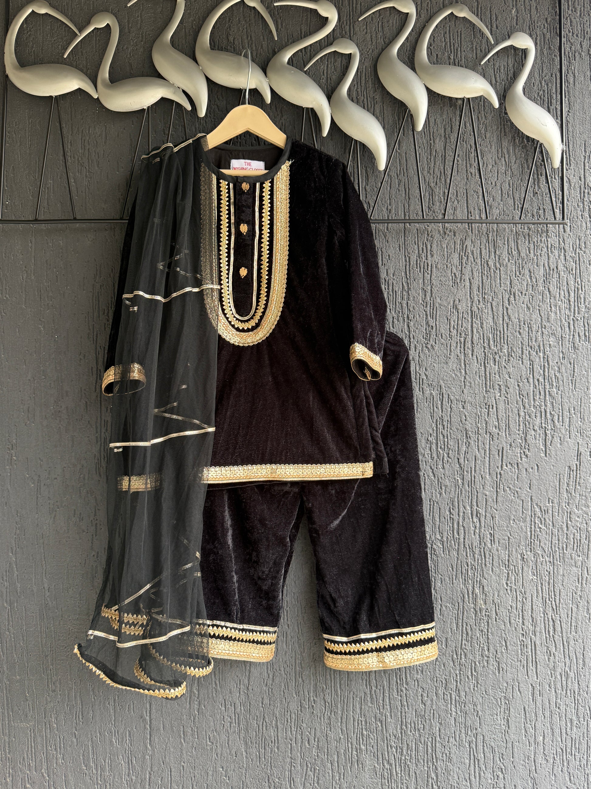 | Black velvet kurta co-ord set featuring beautiful lace enhancements on the front and hem. The kurta includes a front placket opening and pure cotton lining for added comfort. The bottoms have an elasticated waist and lace-trimmed hem. The look is completed with a soft net dupatta adorned with gota work. |