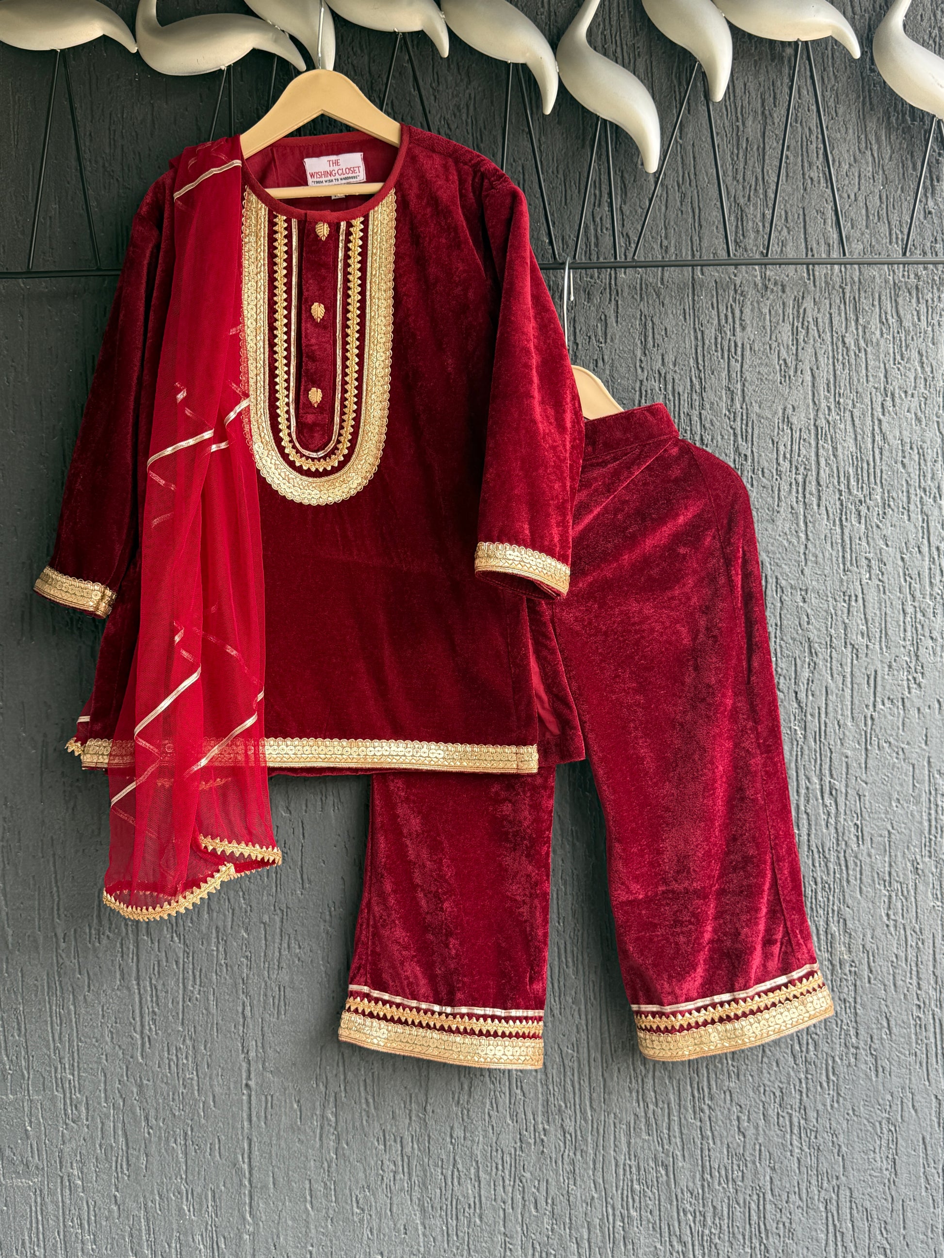 | Maroon velvet kurta co-ord set featuring beautiful lace enhancements on the front and hem. The kurta includes a front placket opening and pure cotton lining for added comfort. The bottoms have an elasticated waist and lace-trimmed hem. The look is completed with a maroon soft net dupatta adorned with gota work. |