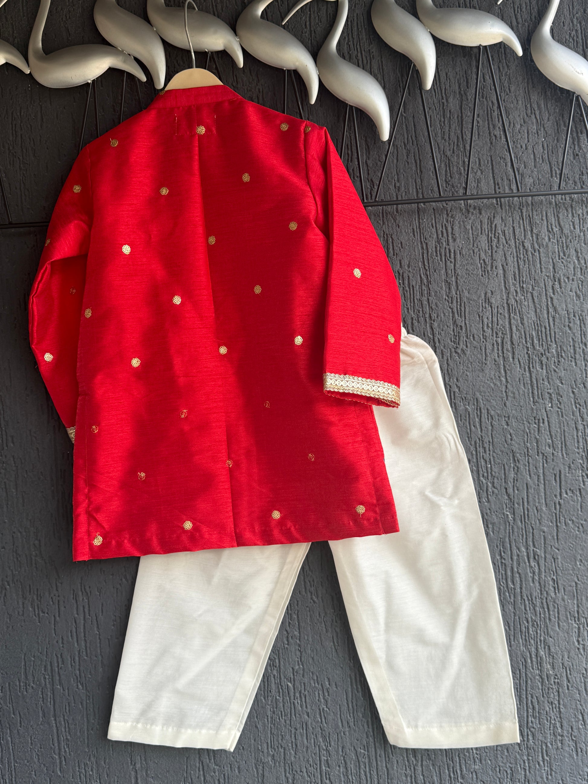 | This kurta set radiates festive charm with its rich red hue and elegant detailing. The kurta features delicate golden embroidered motifs throughout, complemented by a beautifully adorned placket with golden lace and buttons. The hemline showcases a vibrant traditional print in red, blue, and orange tones, adding a lively ethnic touch. Golden trims on the cuffs further enhance the refined look. Paired with off-white pyjama bottoms for a balanced contrast, this outfit is perfect for festive celebrations, weddings, or cultural events, blending classic style with modern sophistication. |