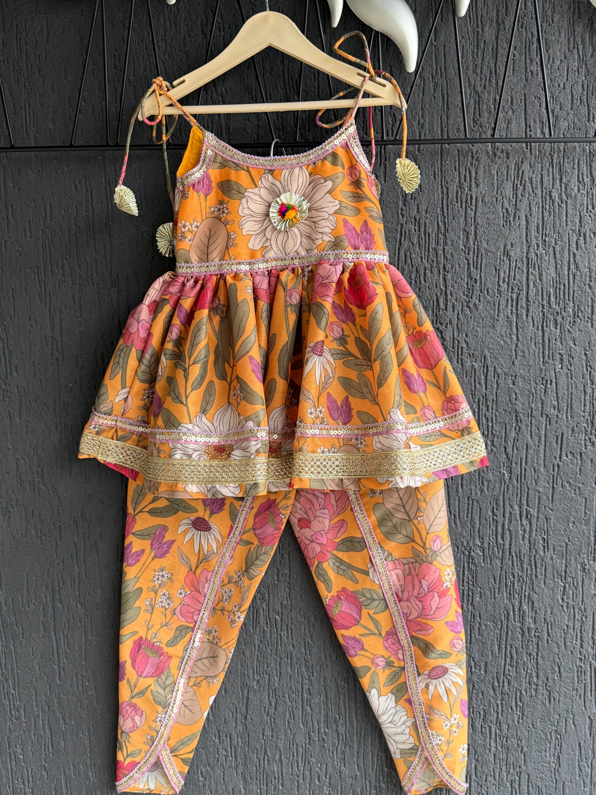 | Orange bold floral frock-style noodle-strap kurta dhoti set. The top features beautiful lace embellishments and a back opening. It also comes with pure cotton lining. The bottom has a dhoti-style design enhanced with lace detailing and an elasticated waistband. The outfit is completed with a beautiful contrasting lilac frill dupatta to complete the look. |