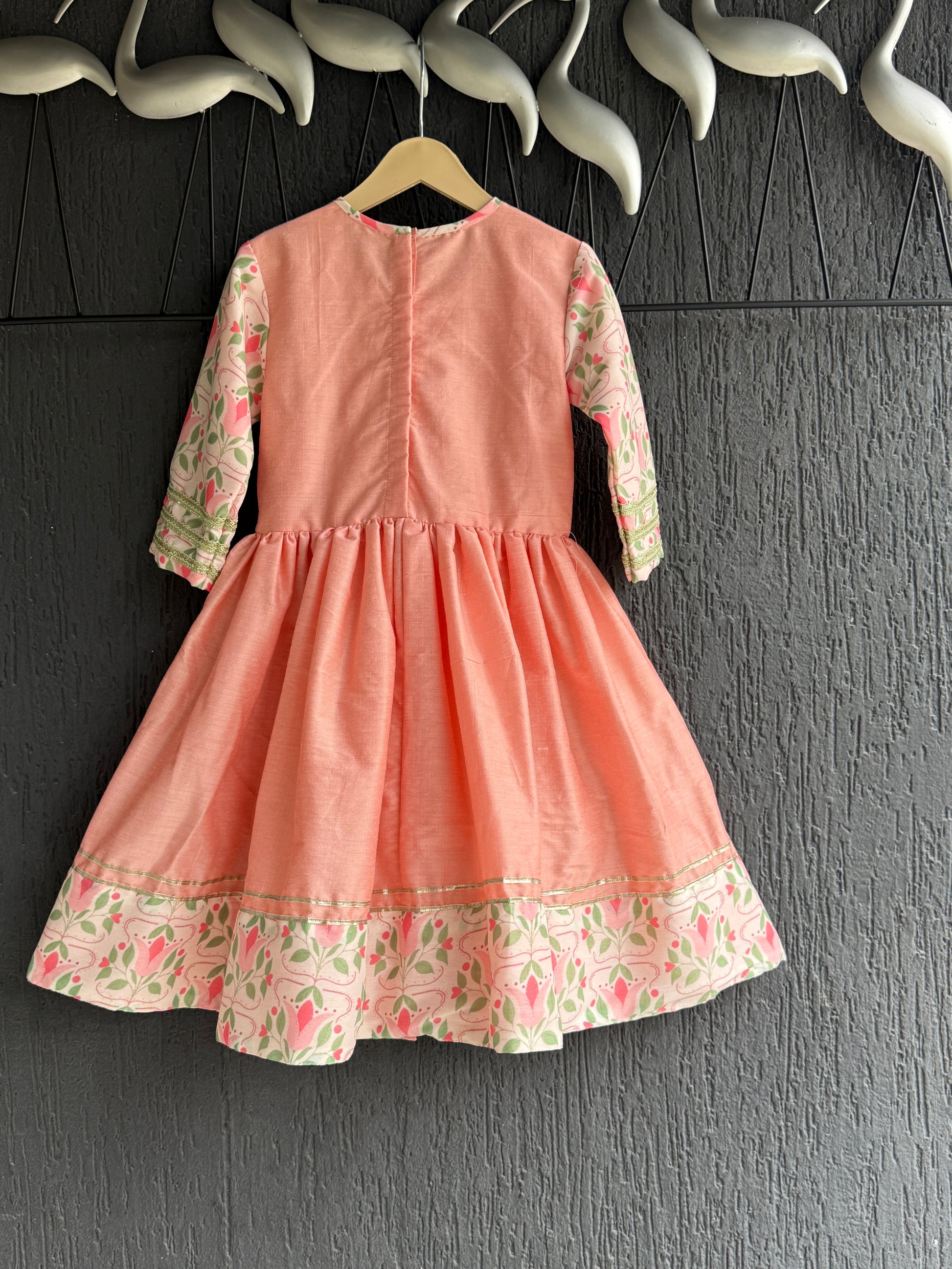 | Peach cotton silk frock-style kurta featuring a jewelled neckline and delicate tassels around the ghera. The top comes with printed sleeves and a contrasting border for an elegant look. The bottoms feature a matching print, enhanced with lace detailing at the hem |