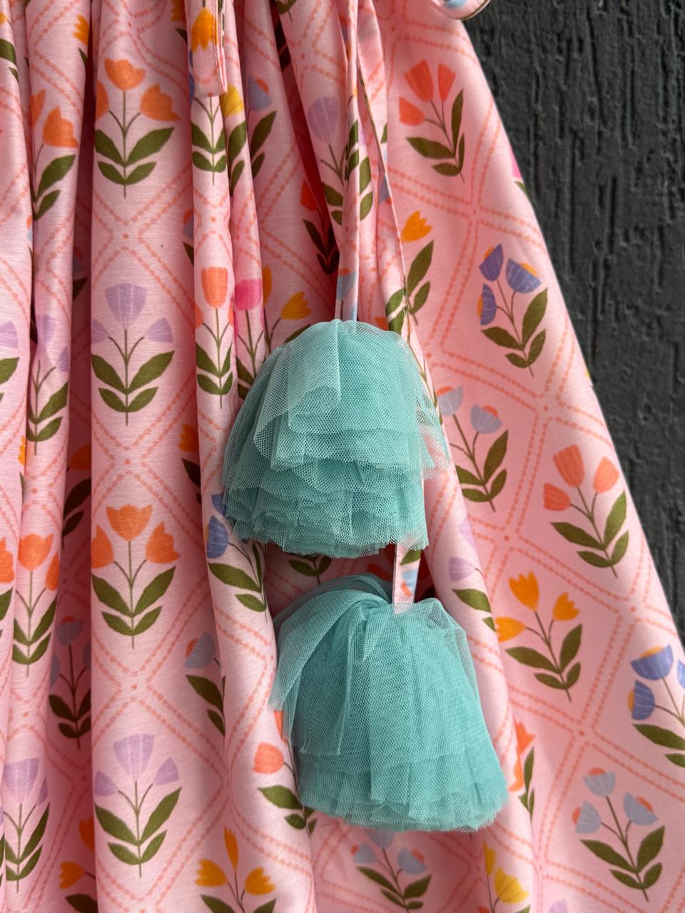 | Pink floral printed co-ord set lehenga — a perfect go-to attire for any festivity or family function. The blouse features a contrasting net frilled yoke with gathered detailing around it, along with printed sleeves enhanced with lace accents and a back opening. The skirt showcases an all-over floral print with soft cotton lining, adorned with beautiful net tassels around the hem. The bottom is fully elasticated for a comfortable fit. The look is completed with a contrasting sky-blue net dupatta finished with yellow frills. This stunning ensemble is sure to turn heads at every occasion. |